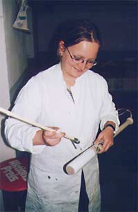 | Rechts: Schließlich wurde in zwei Schichten die Deckfarbe aufgetragen, eine besonders schlagfeste Acrylfarbe. Der hölzerne Schaft wurde lackiert. Auf diese Weise sind die Schläger wetterbeständig. | ![]() | |